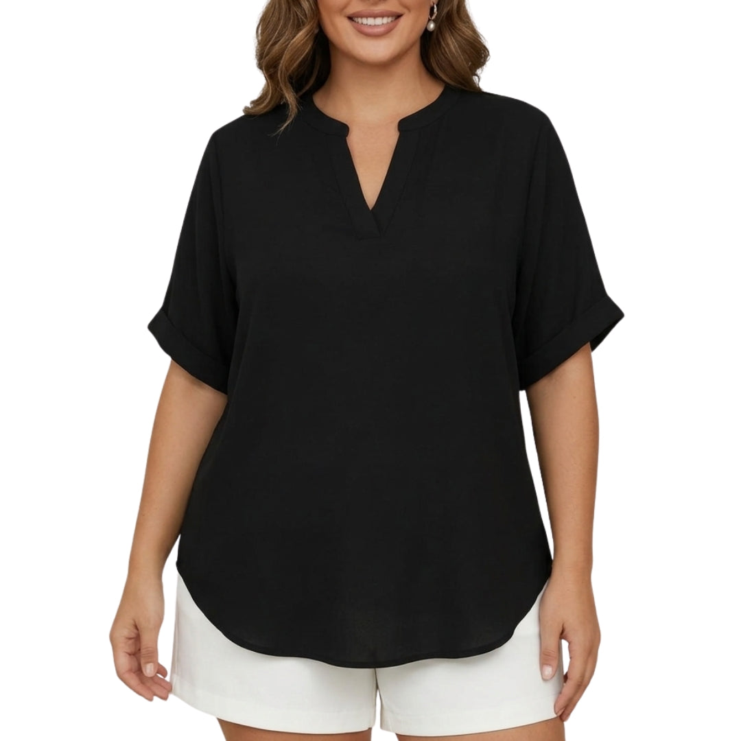 Den enkla, enfärgade blusen är lätt att styla med allt i garderoben. Matcha den med jeans för en avslappnad vardagslook, leggings för komfort eller shorts för en fräsch sommaroutfit. De korta ärmarna och den avslappnade silhuetten skapar en balanserad form som passar många kroppstyper.